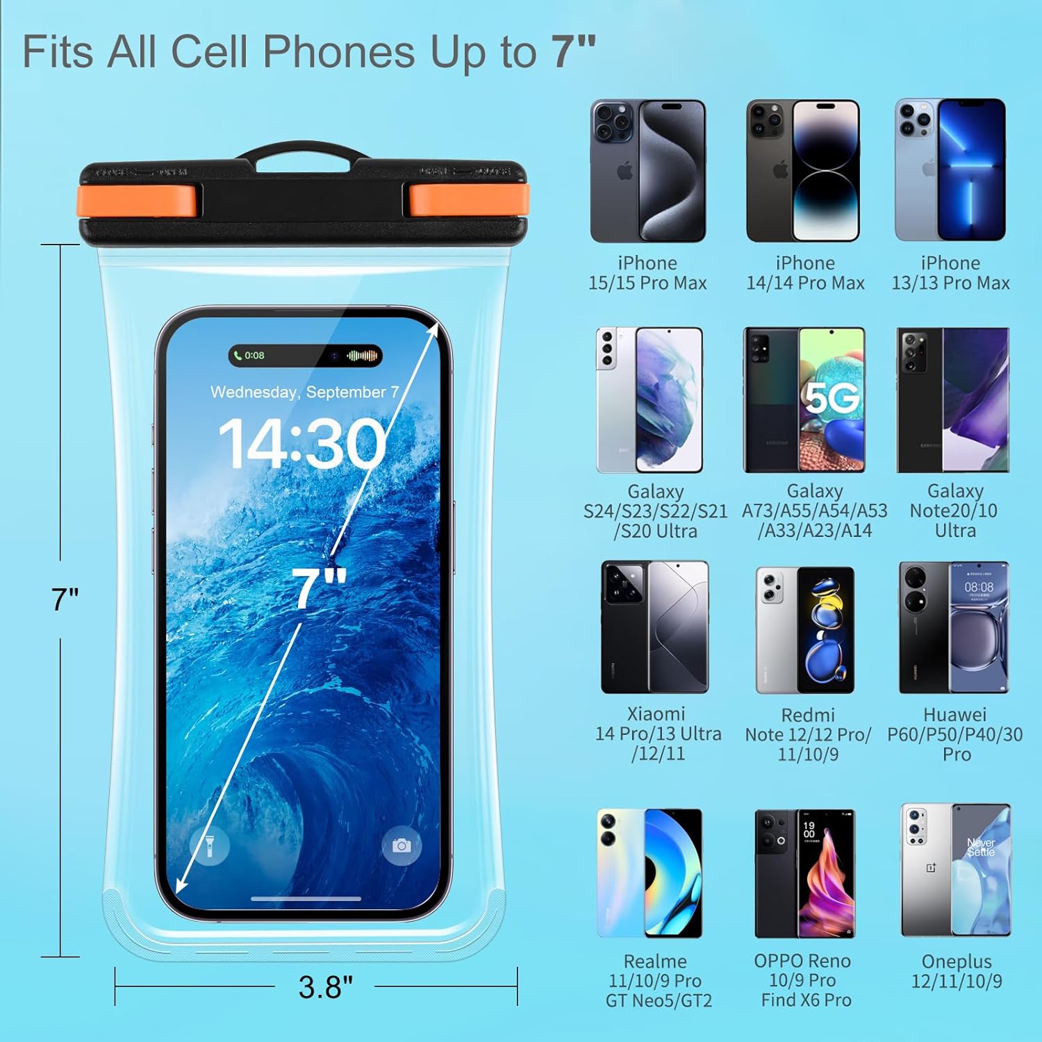 - 【Compatible With 99% Phones】The waterproof phone case is compatible with phones up to 7.2 inches (Thick Phone Case Friendly), comes with a neck strap for easy carrying. Compatible with iPhone 15, 15 Pro, 15 Pro Max, 15 Plus, 14, 14 Pro, 14 Pro Max, 14 Plus, 13, 13 Pro, 13 Pro Max, 13 Mini, 12, 12 Pro, 12 Pro Max, 12 Mini, 11, 11 Pro, 11 Pro Max, XS, XS Max, XR, X, Galaxy S24, S23, S22, S21, S20 Ultra, A72, A71, A52, A51, LG, Moto, Pixel, Android devices, as well as important vacation documents such as ID cards, credit cards, cash, passports, etc