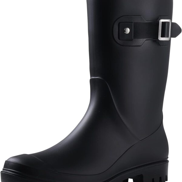 - 【Anti-Slip and Good Traction】Heavy-duty lug tread outsole has excellent stability and slip resistant performance, provide good grip and traction, keep you safe on slippery ground. Stride through puddles with these mid-calf rain boots, you can enjoy the rain in the cozy and dry. Designed as your rainy weather companion.