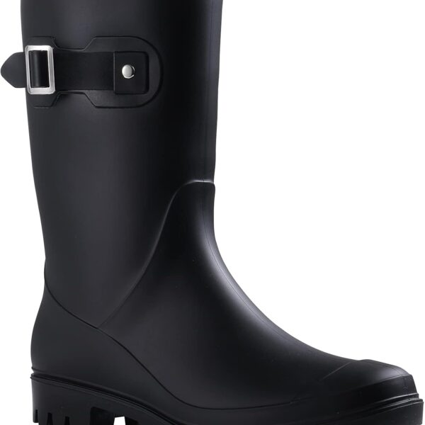 - 【Stylish Design】 Women’s Mid Calf Rain Boots feature classic glossy upper and round-toe silhouette, easily match with a variety of clothes, provide protection from rain without sacrificing style. The trendy design and neutral shades make the ensemble look vivid, give you a good emotion all day.